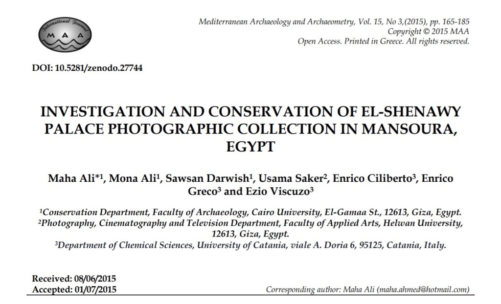 Paper-based photographic collections are an essential part of the Egyptian cultural heritage both for their artistic and documentary value and as a record of the history of photography, as a technique as well as a form of artistic expression. Due to their significance, the interest in photographs is growing worldwide and institutions are making great efforts to increase access to photographic collection, as well as preserve originals for future generations. The threats to photographs are many. They are very sensitive to fluctuating temperatures and relative humidity, frequent handling, air pollution, light, and improper storage and display. Unlike other paper objects, photographs have special conservation requirements due to their complex and unique nature. A private collection was selected for this study. The collection consists of five black and white photographic prints documenting one of the most valuable structures of architectural heritage in the city of El-Mansoura. This paper describes the signs of deterioration present in the collection through documenting the preservation status of El-Shenawy palace photographic collection. It also describes the conservation treatments carried out to prolong their lifespan. Prior to treatment, the photographs were characterized and studied by visual inspection, digital camera, Fourier transform infrared spectroscopy (FTIR), and X-ray photoelectron spectroscopy (XPS). Scanning electron microscope (SEM) provided with an energy dispersive X-ray spectroscopy unit was used to identify the components of the photographs, assess their preservation status, as well as study the morphology of the paper fibres in both the primary and secondary supports. Microbiological studies and pH measurements were also carried out. The results of the investigations revealed that image silver in most cases suffered from sulfiding, the secondary supports suffered from both oxidation and hydrolysis, and the gelatin binder also showed signs of degradation. Based on the results of previous studies, the following interventive conservation procedures were selected and carried out: disinfection, cleaning, dismantlement of the secondary support, deacidification, tear mending and compensating for losses, remounting, retouching, and rehousing.