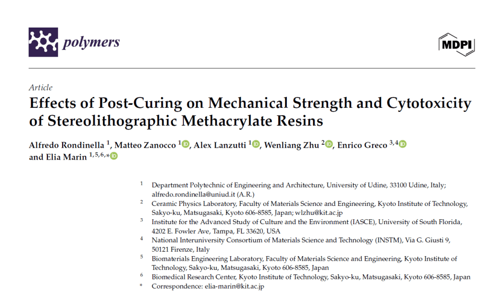 This study investigated the influence of curing temperature and time on both the mechanical properties and cytotoxicity of stereolithographic polymethyl methacrylate (PMMA) resin. After printing using stereolithographic equipment, the resin was cured at 45 °C, 60 °C, and 75 °C for up to 120 min. Our results reveal that the mechanical properties achieved a peak after approximately 30 min of curing at the two highest temperatures, followed by a subsequent decrease, while curing at 45 °C resulted in a constant increase in mechanical properties up to 120 min. Testing with S. epidermidis and E. coli exhibited a bland antibacterial effect, with the number of living bacteria increasing with both the time and temperature of curing. To assess potential cytotoxicity, the materials were also tested with human fibroblasts, and the trends observed were similar to what was previously seen for both bacteria strains. Interestingly, an association was observed between the intensity ratio of two Raman bands (around 2920 and 2945 cm−1), indicative of long-PMMA-chain formation and cytotoxicity. This finding suggests that Raman spectroscopy has the potential to serve as a viable method for estimating the cytotoxicity of 3D printed PMMA objects.